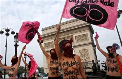 Σύμφωνα με την γαλλική εφημερίδα «Liberation», δέκα γυμνόστηθες ακτιβίστριες συγκεντρώθηκαν κοντά στην Αψίδα του Θριάμβου (στο ύψος στης πρεσβείας του Κατάρ) μαγνητίζοντας τα βλέμματα των περαστικών.