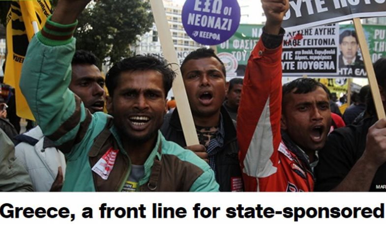 Το άρθρο περιγράφει περιστατικά βίας κατά μεταναστών, εξηγώντας πως παρότι τα μέλη της Χρυσής Αυγής είναι σε μεγάλο βαθμό υπεύθυνα για τη βία αυτή, οι πολιτικοί ηγέτες της χώρας -οι αρχές επιβολής του νόμου και το δικαστικό σύστημα- έχουν εμφανώς αποτύχει να αντιμετωπίσουν το κύμα του ρατσισμού.