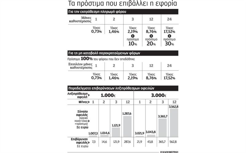 β) Τόκοι οι οποίοι ανέρχονται σε 0,73% για κάθε μήνα εκπρόθεσμης καταβολής, καθώς υπολογίζονται με ετήσιο επιτόκιο 8,76% (8,76% / 12 μήνες = 0,73% τον μήνα). Οι τόκοι επί των φορολογικών οφειλών επιβάλλονται από την επόμενη μέρα της λήξης της κανονικής προθεσμίας πληρωμής.
