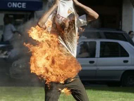 Άλλοι διαδηλωτές κατάφεραν να σβήσουν τις φλόγες, όμως ο άνδρας υπέστη εγκαύματα στο πρόσωπο και στα χέρια του. Στη συνέχεια διακομίστηκε σε νοσοκομείο, όπου σύμφωνα με την αστυνομία, νοσηλεύεται σε κρίσιμη κατάσταση.