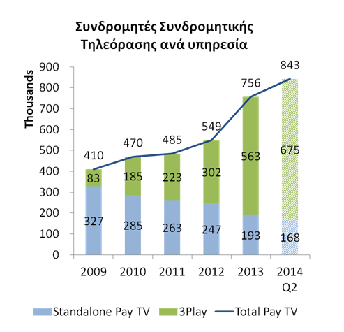 Όλες οι κινήσεις που υλοποιούνται την τηλεπικοινωνιακή αγορά δείχνουν ότι είναι πλέον ξεκάθαρο πως η συνδρομητική τηλεόραση αποτελεί τη βάση πάνω στην οποία οι εταιρείες του κλάδου μπορούν να προσφέρουν τις υπηρεσίες τους. Και αυτό όταν δεδομένου ότι το paytv διαθέτει ακόμη χαμηλό ποσοστό διείσδυσής στην Ελλάδα. Είναι ενδεικτικό πως από το 11% το 2011, η διείσδυση της συνδρομητικής τηλεόρασης στη χώρα μας αυξήθηκε στο 18% το 2013, ενώ για το 2014 αναμένεται να ξεπεράσει το 20%. Το ποσοστό αυτό παραμένει σημαντικά χαμηλότερο από τα αντίστοιχα ποσοστά διείσδυσης της συνδρομητικής τηλεόρασης στην Ευρώπη, με τις υπόλοιπες Μεσογειακές χώρες να κυμαίνονται στο 25%, και την υπόλοιπη Ευρώπη να ξεπερνά το 50%.