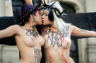 Σε μια πρωτότυπη διαμαρτυρία ενάντια στην ομοφοβία, προχώρησαν δύο νεαρές ακτιβίστριες στο Ρίο ντε Τζανέιρο. Οι δύο γυναίκες ξεγυμνώθηκαν, στήθηκαν έξω από εκκλησία στο κέντρο της πόλης, «σταυρώθηκαν» και φόρεσαν στο κεφάλι τους αγκαθωτό στεφάνι και άρχισαν να ανταλλάσσουν καυτά φιλιά.