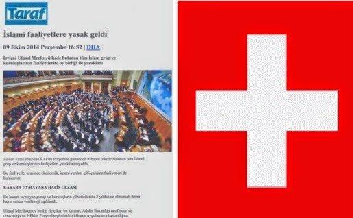Όπως αναφέρουν οι δημοσιογραφικές πληροφορίες από την Τουρκία, η ελβετική βουλή που συνεδρίασε στις 9 Οκτωβρίου αψηφώντας όλες τις προειδοποιήσεις της Ευρωπαϊκής Ένωσης προχώρησε σε ένα χαρακτηριστικό ψήφισμα σύμφωνα με το οποίο, από τις 9 Οκτωβρίου και μετά απαγορεύονται όλες οι δημόσιες δραστηριότητες των μουσουλμανικών ιδρυμάτων στην ελβετική επικράτεια που κρίνονται παράνομες, ενώ κάθε άλλη δραστηριότητα των μουσουλμανικών κοινοτήτων οικονομικού ή «ανθρωπιστικού» όπως αναφέρεται χαρακτήρα, κρίνεται με τον νέο νόμο παράνομη και θα διώκεται από τις ελβετικές αρχές ασφαλείας.