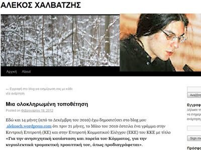 Ο Αλέκος Χαλβατζής ανήρτησε στο προσωπικό του ιστολόγιο κείμενο 11.000 λέξεων, στο οποίο περιλαμβάνονται παρατηρήσεις για τη δράση και λειτουργία του ΚΚΕ, την επιστολή που είχε στείλει στην Κ.Ε. του κόμματος με τίτλο «για την ανησυχητική κατάσταση και πορεία του Κόμματος, για την κυριολεκτικά τρομακτική προοπτική του, όπως προδιαγράφεται», καθώς και τωρινές απόψεις, οι οποίες, όπως υποστηρίζει, τον δικαιώνουν.