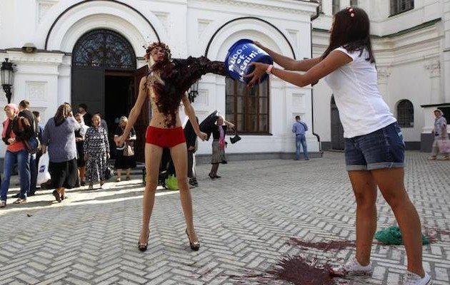 Οι ακτιβίστριες είχαν γράψει στο σώμα τους συνθήματα, όπως: «Σταματήστε τον πόλεμο του Πούτιν» και «σταματήστε να αγνοείτε την αιματοχυσία στην Ουκρανία» και έριξαν κόκκινο κρασί επάνω τους, συμβολίζοντας το αίμα των Ουκρανών πολιτών.