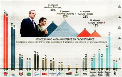 Τέλος, το 32% των ερωτηθέντων θεωρεί καταλληλότερο πρωθυπουργό τον Αντώνη Σαμαρά και το 18% τον Αλέξη Τσίπρα.