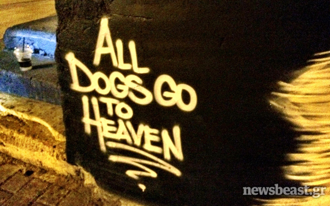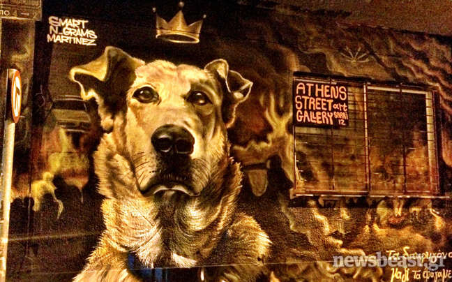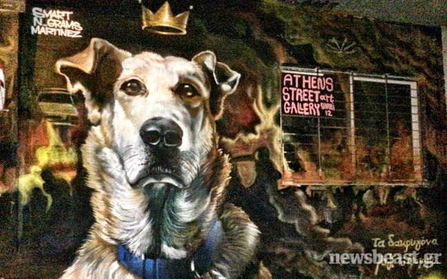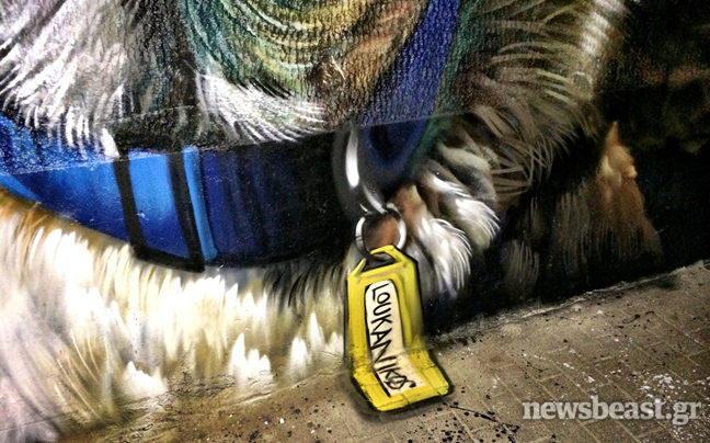 Ένα γκράφιτι που απεικονίζει τον Λουκάνικο, τον αγαπημένο σκύλο – διαδηλωτή, κοσμεί πλέον την περιοχή του Ψυρρή στο κέντρο της Αθήνας.