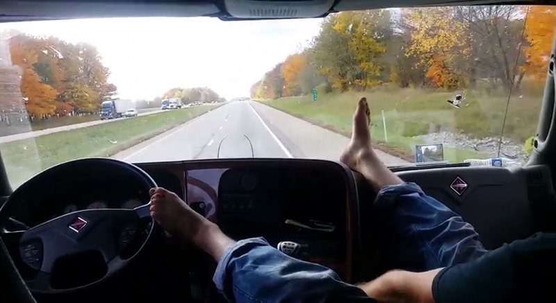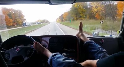 Ο οδηγός ενός φορτηγού που πρωταγωνιστεί στο βίντεο παρουσιάζει την «εγκληματική» του ενέργεια, να οδηγεί –κυριολεκτικά- με τα πόδια σε δρόμο ταχείας κυκλοφορίας του εξωτερικού.
