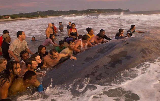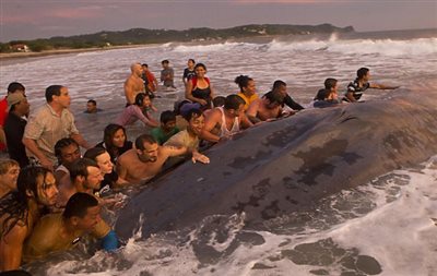 Δεκάδες τουρίστες αλλά και ντόπιοι προσπάθησαν να σώσουν την Παρασκευή μια μπλε φάλαινα που είχε εξοκείλει σε παραλία της Νικαράγουας. Παρά τις προσπάθειές τους, όμως, η φάλαινα πέθανε αργά την Παρασκευή και θάφτηκε με τη βοήθεια μηχανημάτων το Σάββατο στην παραλία.
