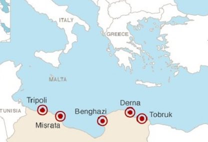 Η μαύρη σημαία του Ισλαμικού Κράτους κυματίζει σε κυβερνητικά κτίρια, τα οχήματα της αστυνομίας φέρουν τα διακριτικά της οργάνωσης, το τοπικό στάδιο ποδοσφαίρου χρησιμοποιείται για δημόσιες εκτελέσεις. Κι όμως, η εικόνα δεν προέρχεται από μία πόλη της Συρίας ή του Ιράκ αλλά από μία στις ακτές της Μεσογείου, στη Λιβύη. Σύμφωνα με το CNN, οι μαχητές του Ισλαμικού Κράτους έθεσαν υπό τον πλήρη έλεγχό τους την πόλη Derna, πληθυσμού περίπου 100.000 ατόμων, όχι μακριά από τα αιγυπτιακά σύνορα και μόλις 200 μίλια από τις νότιες ακτές της Ευρωπαϊκής Ένωσης, με πιο κοντικό σημείο την... ελληνική Κρήτη (σύμφωνα και με το χάρτη).