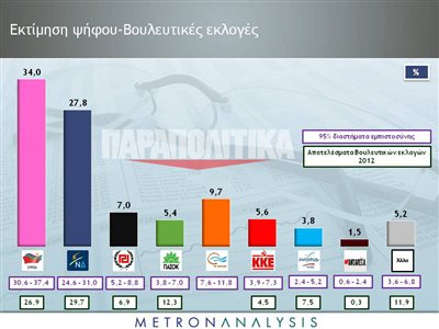 Συγκεκριμένα ο ΣΥΡΙΖΑ συγκεντρώνει ποσοστό 34% τη στιγμή που η Νέα Δημοκρατία βρίσκεται στο 27,8%