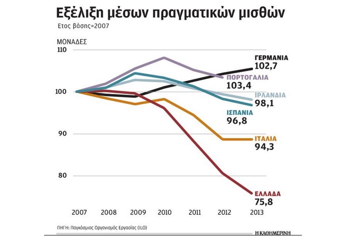 Όπως αναφέρει η Καθημερινή, ο μέσος μισθός στην Ελλάδα έχει μειωθεί κατά 24,2% από το 2007 ενώ πολύ μεγάλη υπήρξε η μείωση μισθών και σε Ιταλία (5,7%), Βρετανία (7,1%) και κάπως μικρότερη σε Ισπανία (3,2%) και Ιρλανδία (2,1%).