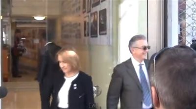 Τότε, με τη συνοδεία της συζύγου του, Μάρα Ζαχαρέα, και τον άντρα της προσωπικής του φρουράς απομακρύνθηκε με γοργό βήμα από την είσοδο του κτιρίου και κατευθύνθηκε στο αυτοκίνητό του!