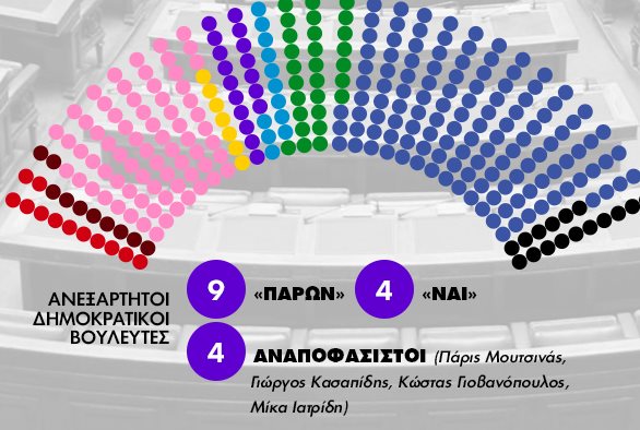 ΑΝΕΞΑΡΤΗΤΟΙ ΔΗΜΟΚΡΑΤΙΚΟΙ ΒΟΥΛΕΥΤΕΣ: 9 «ΠΑΡΩΝ» - 4 «ΝΑΙ» ΚΑΙ 4 ΑΝΑΠΟΦΑΣΙΣΤΟΙ: Πάρις Μουτσινάς, Γιώργος Κασαπίδης, Κώστας Γιοβανόπουλος, Μίκα Ιατρίδη