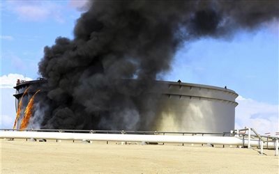 Η πρώτη δεξαμενή πήρε φωτιά την Πέμπτη, όταν χτυπήθηκε από ρουκέτα την οποία εκτόξευσαν οι ισλαμιστές από ταχύπλοο, κατά τη διάρκεια της εφόδου την οποία εξαπέλυσαν στις πετρελαϊκές εγκαταστάσεις της ανατολικής Λιβύης, είχε δηλώσει την Πέμπτη ο Αλί Αλ Χάσι, εκπρόσωπος της δύναμης η οποία έχει αναλάβει τη φρούρηση των εγκαταστάσεων.