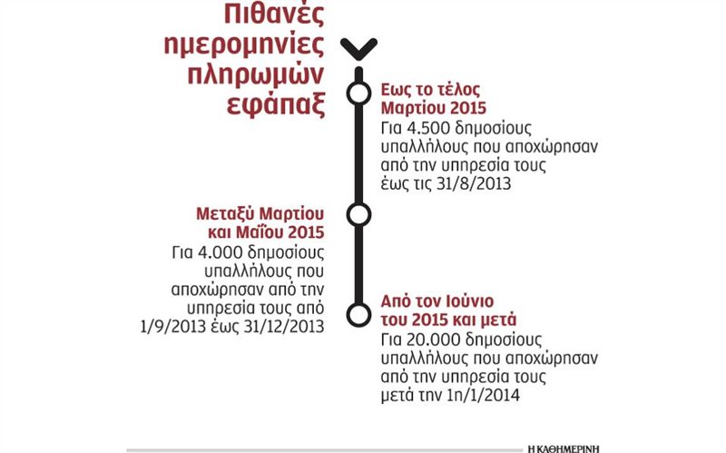 - Δημόσιοι υπάλληλοι που αποχώρησαν από την υπηρεσία τους από τις αρχές του 2014 και μετά. Στη λίστα της αναμονής βρίσκονται τουλάχιστον 20.000 άτομα, που δεν ξέρουν πότε και τι εφάπαξ θα λάβουν. Εκτιμάται ότι η καταβολή της παροχής θα ξεκινήσει από τον Ιούνιο του 2015 και μετά.