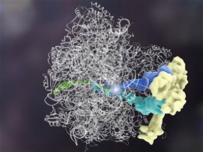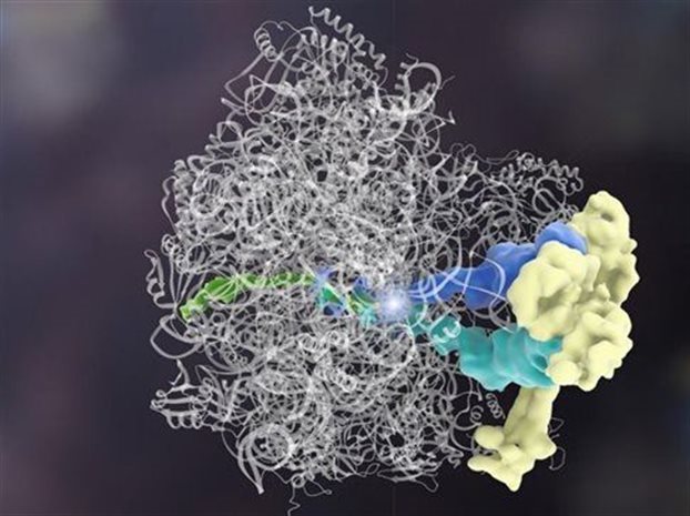 Η πρωτεΐνη Rqc2 (κίτρινο) συνδέεται σε μόρια tRNA (μπλε) και προσθέτει αμινοξέα σε μια ελλιπή πρωτεΐνη (πράσινο). Όλα αυτά συμβαίνουν στο ριβόσωμα (άσπρες κορδέλες). Credit: (Janet Iwasa, University Of Utah)