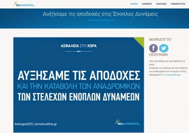 Πολλοί θα πουν ότι επρόκειτο για μια απλή γκάφη ενός κομματικού επιτελείου σε μια προεκλογική εκστρατεία εξπρές. Οι στρατιωτικοί που εντόπισαν στην ιστοσελίδα της ΝΔ το προεκλογικό μήνυμα που έλεγε “αυξήσαμε τους μισθούς των στρατιωτικών” δεν πιστεύουν στην θεωρία της γκάφας. Γιατί το “αυξήσεις στους στρατιωτικούς” έχει ακουστεί πάρα πολλές φορές από κομματικά και κυβερνητικά στελέχη σε πάρα πολλές δημόσιες εμφανίσεις τους. Και παρά το γεγονός ότι επισημάνθηκε αμέτρητες φορές ότι αυτή η διαστρέβλωση ενοχλεί κάποιοι το …έκαναν και προεκλογικό σκλόγκαν! Το τι ακολούθησε αμέσως μετά από τον “εντοπισμό” του είναι εύκολο να το φανταστούμε. Φάνηκε εξάλλου από το γεγονός ότι λίγες ώρες μετά το σχετικό …σλόγκαν κατέβηκε από την σελίδα της ΝΔ. onalert