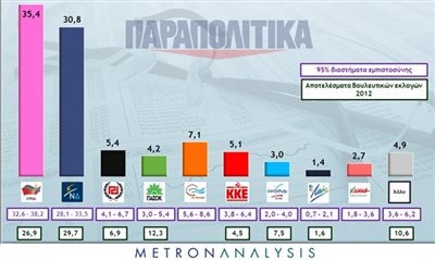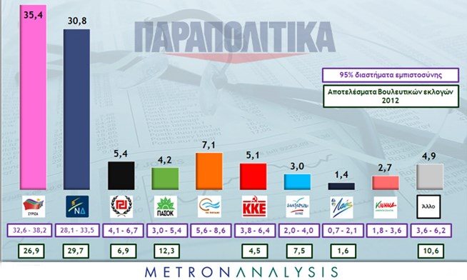 Ειδικότερα, ο ΣΥΡΙΖΑ καταγράφει ποσοστό 35,4% και ακολουθεί η Νέα Δημοκρατία με 30,8%. Σε σχέση με την προηγούμενη δημοσκόπηση της METRON ANALYSIS, ο ΣΥΡΙΖΑ αυξάνει τη διαφορά από τη Νέα Δημοκρατία. Τρίτο κόμμα σύμφωνα με την μέτρηση είναι το ΠΟΤΑΜΙ με 7,1 % και ακολουθούν η Χρυσή Αυγή με 5,4%, το ΚΚΕ με 5,1%, το ΠΑΣΟΚ με 4,2%, οι ΑΝΕΛ με 3,0% ενώ το νέο κόμμα του Γιώργου Παπανδρέου καταγράφει ποσοστό 2,7%.
