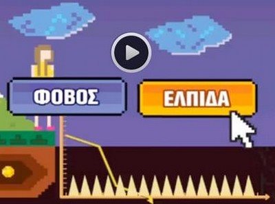 Ένα video game, που αποτελεί το νέο προεκλογικό σποτ του ΣΥΡΙΖΑ και θυμίζει έντονα το γνωστό ηλεκτρονικό παιχνίδι Super Mario, έδωσε την Τετάρτη στη δημοσιότητα η Κουμουνδούρου. Στο νέο σποτ, που έχει τίτλο «Διάλεξε Ελπίδα!», πρωταγωνιστεί μια γυναικεία φιγούρα η οποία μπροστά σε ένα κενό, φτάνει στην άκρη και εμφανίζονται δυο επιλογές: φόβος ή ελπίδα. Αν πατήσει ο «παίκτης» το φόβο βγαίνουν από κάτω.. δόντια. Οπότε, ο «παίκτης» αλλάζει την επιλογή και παίρνει την ελπίδα…. trelokouneli
