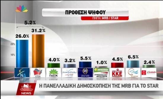 Προβάδισμα 5,2 μονάδων στον ΣΥΡΙΖΑ δίνει η τελευταία πανελλαδική δημοσκόπηση της MRB για το Star. Συγκεκριμένα, ο ΣΥΡΙΖΑ συγκεντρώνει ποσοστό 31,2%, ενώ η ΝΔ 26%. Τρίτο κόμμα το Ποτάμι με 6,5% και στην τέταρτη θέση η ΧΑ με 5,5%. Ακολουθεί το ΚΚΕ με 4,5%, το ΠΑΣΟΚ με 4% και οι ΑΝΕΛ οριακά στη βουλή με 3,2%. Το Κίνημα του Γ.Παπανδρέου μένει εκτός βουλής με 2,4%, όπως και ο συνασπισμός Πράσινοι-ΔΗΜΑΡ με 1%.