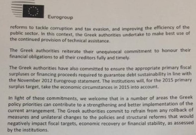 Υπό το φως αυτών των δεσμεύσεων, καλωσορίζουμε ότι σε έναν αριθμό τομέων, οι προτεραιότητες της ελληνικής πολιτικής μπορούν να συνεισφέρουν σε μια ενίσχυση και καλύτερη εφαρμογή της παρούσας συμφωνίας. Οι ελληνικές αρχές δεσμεύονται να απόσχουν από κάθε ανατροπή μέτρων ή μονομερείς αλλαγές στις πολιτικές αυτές και στις διαρθρωτικές μεταρρυθμίσεις που θα είχαν αρνητικές συνέπειες στους δημοσιονομικούς στόχους, στην οικονομική ανάκαμψη ή τη χρηματοπιστωτική σταθερότητα, όπως αξιολογούνται από τους θεσμούς.