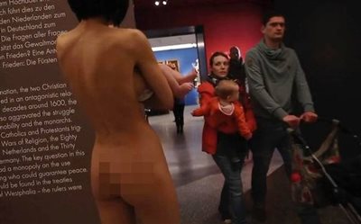 Παντελώς γυμνή, με ένα μωρό στην αγκαλιά, περιφερόταν στους διαδρόμους μουσείου του Μούνστερ, στη βορειοδυτική Γερμανία, προκαλώντας ποικίλλες αντιδράσεις στους επισκέπτες του μουσείου.Στο γυμνό θέαμα, άλλοι απλώς μειδιούσαν, άλλοι κοκκίνιζαν γυρίζοντας αλλού το βλέμμα, άλλοι απλώς προσπερνούσαν αδιάφοροι.