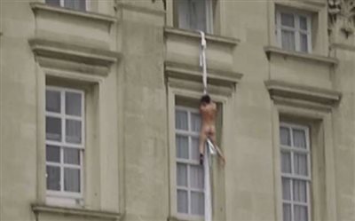 Μοιάζει με κάποιον που... πιάστηκε στα «πράσα» και βιάζεται να φύγει από την πίσω πόρτα: Το βίντεο που αναρτήθηκε στο YouTube εμφανίζει έναν άνδρα σε αδαμιαία περιβολή, γραπωμένο από ένα αυτοσχέδιο «σχοινί» από σεντόνια, να προσπαθεί να κατέβει από το παράθυρο της βασιλικής κατοικίας.
