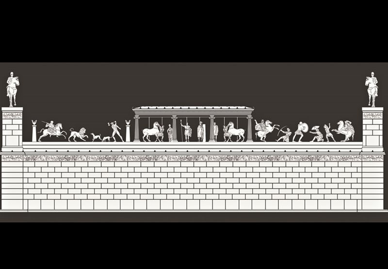 Από τα γλυπτά ξεχωρίζει ο κορμός θωρακοφόρου ιππέα υπερφυσικού μεγέθους, ένας άλλος ανδρικής μορφής, μάλλον μεσήλικα, τυλιγμένης στη χλαμύδα και στο κέντρο του εντυπωσιακού μνημείου μία πολυπρόσωπη κατά πάσα πιθανότητα σκηνή αποχαιρετισμού πολεμιστών, ενώ αριστερά και δεξιά της κεντρικής σύνθεσης έχουν βρεθεί ελάχιστα στοιχεία που οδηγούν σε σκηνή κυνηγιού και πιθανότατα μάχης.
