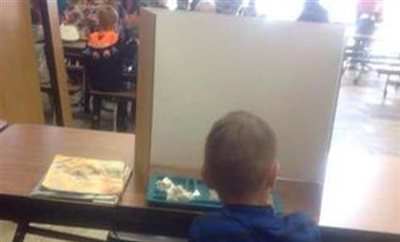 Η φωτογραφία που τράβηξε η ίδια η γιαγιά του 6χρονου, απεικονίζει το αγόρι να βρίσκεται στην αίθουσα του φαγητού χωριστά από τους υπόλοιπους συμμαθητές του, ενώ η δασκάλα έχει τοποθετήσει μπροστά του χάρτινο παραβάν προκειμένου να μην έχει καμία οπτική επαφή.