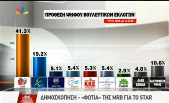 Προβάδισμα περίπου 20 μονάδων στον ΣΥΡΙΖΑ έναντι της ΝΔ δείχνει η δημοσκόπηση όσον αφορά την πρόθεση ψήφου που πραγματοποίησε η MRB και μεταδόθηκε στο κεντρικό δελτίο ειδήσεων του Star. Πιο συγκεκριμένα, στην ερώτηση «ποιο κόμμα θα ψηφίζατε αν είχαμε την επόμενη Κυριακή εκλογές», το 41,3% απαντά ΣΥΡΙΖΑ και μόνο το 19,2% απαντά ΝΔ! Ακολουθούν, το ΠΟΤΑΜΙ και οι Ανεξάρτητοι Έλληνες που ισοψηφούν με 5,4%, το ΚΚΕ με 5,3% και η Χρυσή Αυγή με 5,1%, ενώ το ΠΑΣΟΚ δεν μπαίνει στην Βουλή, καθώς εμφανίζει ποσοστό μικρότερο του 3% και συγκεκριμένα 2,9%. «Άλλο κόμμα» απαντά το 4,8%, ενώ το ποσοστό των «Αναποφάσιστων» αγγίζει το 10,6%. Στο ερώτημα «πως θα χαρακτηρίζατε τη νέα συμφωνία με τους εταίρους», όπως φαίνεται και στην παρακάτω κάρτα, η πλειοψηφία των Ελλήνων (70,3%) θεωρεί ότι είναι καλύτερη από αυτήν που ίσχυε μέχρι τώρα. Αντίθετη, ωστόσο, άποψη έχουν περίπου 20 στους 100 Έλληνες (ποσοστό 19,7%), οι οποίοι εκτιμούν ότι είναι χειρότερη ή μάλλον χειρότερη από την προηγούμενη! Για την πλειοψηφία των ερωτηθέντων (39,1%), η νέα συμφωνία, σε αντίθεση με όσα διαμηνύουν κυβερνητικά στελέχη, αποτελεί ή μάλλον αποτελεί συνέχιση του μνημονίου. Τρεις στους 10 Έλληνες (ποσοστό 31,2%), όπως φαίνεται και στην κάρτα που ακολουθεί, βλέπουν τη συμφωνία σαν πραγματικά κάτι καινούργιο! Όσον αφορά στο ερώτημα "Ποιον θεωρείτε καταλληλότερο πρωθυπουργό μεταξύ του Α. Σαμαρά και του Α. Τσίπρα" η εικόνα σύμφωνα με την έρευνα της MRB έχει αλλάξει εντελώς σε σχέση με την προεκλογική περίοδο! Πιο συγκεκριμένα, για το 55,1% καταλληλότερος για πρωθυπουργός είναι πλέον ο πρόεδρος του ΣΥΡΙΖΑ Αλέξης Τσίπρας, ενώ ένα 22,9 % εξακολουθεί να πιστεύει περισσότερο στον Αντώνη Σαμαρά. Για το 18,5% κανείς από τους δύο δεν είναι κατάλληλος, ενώ το 3,6% απαντά με την επιλογή «άλλος, δεν ξέρω, δεν απαντώ». Στα ύψη είναι η δημοτικότητα τόσο του πρωθυπουργού όσο και του υπουργού Οικονομικών real