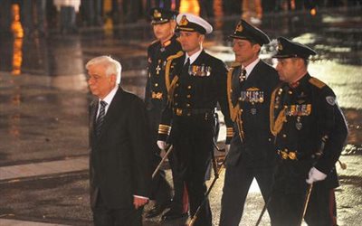 Στις 19.00, κάτω από την ίδια ομπρέλα, ο πρωθυπουργός και η πρόεδρος της Βουλής κατευθύνθηκαν στον 'Αγνωστο Στρατιώτη. Στις 19.05, και κάτω από έντονη βροχόπτωση , ο νέος Πρόεδρος της Δημοκρατίας «ασκεπής» έφτασε στο Μνημείο του 'Αγνωστου Στρατιώτη, όπου κατέθεσε δάφνινο στεφάνι και επιθεώρησε το άγημα της Προεδρικής Φρουράς.