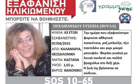 Επειδή η άτυχη γυναίκα αντιμετώπιζε προβλήματα υγείας, είχε ενεργοποιηθεί άμεσα το Εθνικό συντονιστικό πρόγραμμα έγκαιρης και έγκυρης ειδοποίησης των πολιτών σε περιστατικά εξαφάνισης ανθρώπων άνω των 60 χρόνων αλλά, τελικά δεν επετεύχθη ο έγκαιρος εντοπισμός της. press