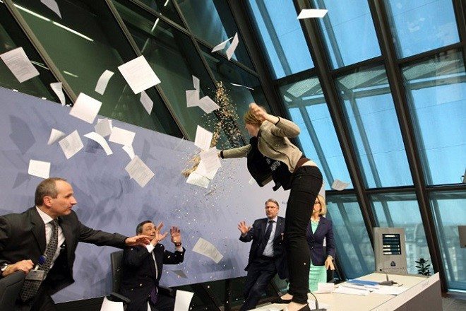 «Σταματήστε τη δικτατορία της ΕΚΤ» φώναξε η διαδηλώτρια την ώρα που σκαρφάλωσε στο τραπέζι μπροστά από τον Μάριο Ντράγκι. Η συνέντευξη Τύπου του προέδρου της Ευρωπαϊκής Κεντρικής Τράπεζας, Μάριο Ντράγκι,διακόπηκε για λίγο σήμερα όταν μια νεαρή γυναίκα ανέβηκε στο πόντιουμ.  Η νεαρή γυναίκα, περίπου 20 ετών, σκαρφάλωσε στο τραπέζι μπροστά από τον Ντράγκι φωνάζοντας στα αγγλικά: «Σταματήστε τη δικτατορία της ΕΚΤ», ένα σύνθημα που είχε γράψει και στο μπλουζάκι της, ενώ παράλληλα πέταξε κομφετί. Η συνέντευξη Τύπου του προέδρου της ΕΚΤ διακόπηκε για μερικά λεπτά και η νεαρή γυναίκα οδηγήθηκε έξω από την αίθουσα. Δείτε το επίμαχο βίντεο: