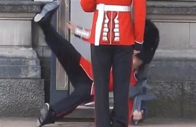 Μία στιγμή ήταν αρκετή για να αλλάξει η έκφραση στα αγέλαστα πρόσωπα των αυστηρών φρουρών των Ανακτόρων του Μπάκιγχαμ. Το περιστατικό συνέβη κατά την αλλαγή της βασιλικής φρουράς στις 11.30 το πρωί. Όταν ο φρουρός ακολούθησε το τελετουργικό με τον συνηθισμένο βηματισμό για να αλλάξει πόστο με τον αριστερόχειρα συνάδελφό του, γλίστρησε κι έπεσε φαρδύς πλατύς στο οδόστρωμα.