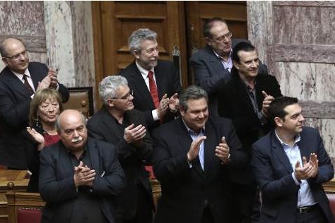 Η νέα «πατέντα» για τη στελέχωση του κρατικού μηχανισμού Κρίνεται, επίσης, σκόπιμο να αναφερθεί η νέα «πατέντα» για τη στελέχωση του κρατικού μηχανισμού, που εισήγαγε η κυβέρνηση (με το άρθρο 24 του νομοσχεδίου για την ανθρωπιστική κρίση): Tο εν λόγω άρθρο αναφέρει: «Στα πολιτικά γραφεία του Πρωθυπουργού, αντιπροέδρων της Κυβέρνησης και υπουργών επιτρέπεται η ανάθεση καθηκόντων ειδικού συμβούλου για ορισμένο χρονικό διάστημα και συγκεκριμένα αντικείμενα, καθ’ υπέρβαση του οριζόμενου ανώτατου αριθμού ειδικών συμβούλων και συνεργατών. Οι ειδικοί σύμβουλοι του προηγουμένου εδαφίου προσλαμβάνονται με αντίστοιχες αποφάσεις του Πρωθυπουργού, αντιπροέδρων της κυβέρνησης ή των αρμοδίων υπουργών και δημοσιεύονται στην Εφημερίδα της Κυβέρνησης. Οι ειδικοί αυτοί σύμβουλοι υπηρετούν εθελοντικά και δεν λαμβάνουν μισθό, αποζημίωση ή άλλη οικονομική απολαβή, εκτός των οδοιπορικών τους». Με τη ρύθμιση αυτή, αφενός, δίνεται η δυνατότητα στην Κυβέρνηση να στελεχώσει, χωρίς αριθμητικό περιορισμό, τον κρατικό μηχανισμό με πάσης φύσεως κομματικά στελέχη (υψηλόβαθμα, χαμηλόβαθμα, ακόμα και αφισοκολλητές). Η ρύθμιση αυτή, αφετέρου, δημιουργεί ανεξέλεγκτες δαπάνες για τα κρατικά ταμεία, αφού το κράτος υποχρεώνεται, πλέον, να πληρώνει οδοιπορικά σε απεριόριστο αριθμό ειδικών συμβούλων, για τις μετακινήσεις τους. Η ομιλία του κ. Βαρβιτσιώτη στη Βουλή «Ακούγοντας τόση ώρα των προηγούμενο αγορητή, μπορώ να παραφράσω μια γνωστή έκφραση του Ταλλεϋράνδου, που λέει ότι «τα λόγια σας τα χρησιμοποιείτε, για να κρύψετε τη σκέψη σας». Γιατί η σκέψη σας δεν είναι καθόλου σε αυτή την κατεύθυνση. Μετά από την αδιανόητη παρουσία εδώ σήμερα του Υπουργού του 12%, που έκανε επαγγελματική καριέρα και σήμερα έρχεται να ικανοποιήσει όσους είχε στην πελατεία του πριν από λίγο καιρό, ακούσαμε μύδρους κατά του κομματικού κράτους, των πελατειακών σχέσεων και μια επανάληψη όλων αυτών των προεκλογικών δεσμεύσεων, για τις οποίες σε μια φράση του ο Πρωθυπουργός έχει πει, παραμονές των εκλογών, τρεις ημέρες πριν από τις εκλογές: «Η παρακαταθήκη που άφησε η Μεταπολίτευση και ο δικομματισμός της περιόδου αυτής είναι γνωστή σε όλους. Το κομματικό κράτος, η αναξιοκρατία, ο νεποτισμός, οι πολιτικές επιλογές χωρίς ενδοιασμό κυριάρχησαν στην Ελλάδα. Όλα αυτά τελειώνουν». Τελειώνουν; Άραγε, τελειώνουν; «Πρώτη φορά Αριστερά», λέγατε, ότι τελειώνουν, όταν μέσα σε ενενήντα μέρες έχετε κάνει όργιο τοποθετήσεων και διορισμών συγγενών και φίλων, «ημετέρων» και ανθρώπων που υπηρετούσαν σε άλλα κόμματα και ήρθαν παραμονές των εκλογών να σας συνδράμουν; Θα είναι η πρώτη φορά που το κάνω. Θα αναγκαστώ να διαβάσω από το Βήμα της Βουλής, γιατί είναι τόσα πολλά τα ονόματα και οι θέσεις που δείχνουν ακριβώς το εύρος των οικογενειακών και κομματικών σας διορισμών, που έχουν έναν και μόνο στόχο: να κάνετε ένα βαθύ κομματικό κράτος. Ξεκινώ. Γενικός Γραμματέας Οικονομικών Σχέσεων στο Υπουργείο Εξωτερικών διορίστηκε ο πρώτος ξάδελφος του Πρωθυπουργού κ. Γιώργος Τσίπρας, υιός του αδερφού του πατέρα του Πρωθυπουργού και αρθρογράφος στην ΑΥΓΗ. Η Αναπληρώτρια Υπουργός Τουρισμού τοποθέτησε Ειδικό Σύμβουλο επί πολιτικών θεμάτων τον αδερφό της Νίκο Κουντουρά, ο οποίος έχει αναλάβει τη σχέση της με τα ΜΜΕ. Ένα άλλο ανδρόγυνο, πέρα από το γνωστό υπουργικό Δρίτσα-Χριστοδουλοπούλου, εντοπίζεται στην Κυβέρνη
