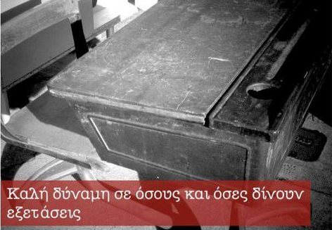 «Σε μία στιγμή μεγάλων απαιτήσεων και ψυχικής έντασης, σταθείτε ψύχραιμα. Επιτυχία είστε εσείς οι ίδιοι, οι μαθητές και οι μαθήτριες. Πέρα και πάνω από το αποτέλεσμα της προσπάθειας σας», αναφέρει ο κ. Τσίπρας στην ανάρτηση του. Συνοδεύει δε την ανάρτηση, με την ασπρόμαυρη εικόνα ενός παλιού ξύλινου σχολικού θρανίου, στο πλαίσιο της οποίας περιλαμβάνεται το μήνυμα: «καλή δύναμη σε όσους και όσες δίνουν εξετάσεις». ethnos