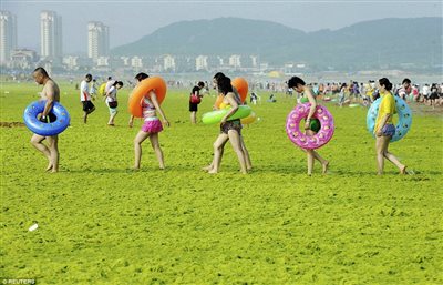 Κανείς δεν ξέρει τι το προκαλεί και από τη στιγμή που οι λουόμενοι δε φαίνεται να ενοχλούνται μάλλον δεν υπάρχει θέμα. Στις παραλίες της Κίνας το νερό έγινε πράσινο αφού καλύφθηκε πλήρως με άλγη. Κανείς δε φαίνεται να προβληματίζεται, τουναντίον οι τουρίστες και οι ντόπιοι κάνουν τις βουτιές τους κανονικά. Η αλήθεια είναι ότι η άλγη δημιουργεί το κατάλληλο εφέ για εκπληκτικές φωτογραφίες. newsbomb
