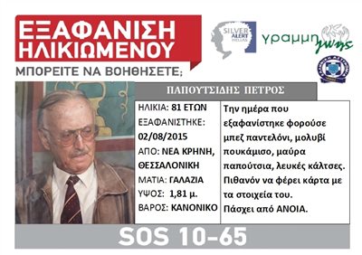 Αγαπητοί φίλοι,Υπάρχει εξαφάνιση 81χρονου από τη Νέα Κρήνη Θεσσαλονίκης. Εάν γνωρίζετε κάτι επικοινωνήστε με τη ΓΡΑΜΜΗ ΖΩΗΣ, όλο το 24ωρο, στην Εθνική Γραμμή SOS 1065.Ευχαριστούμε θερμά για τη συμβολή σας.