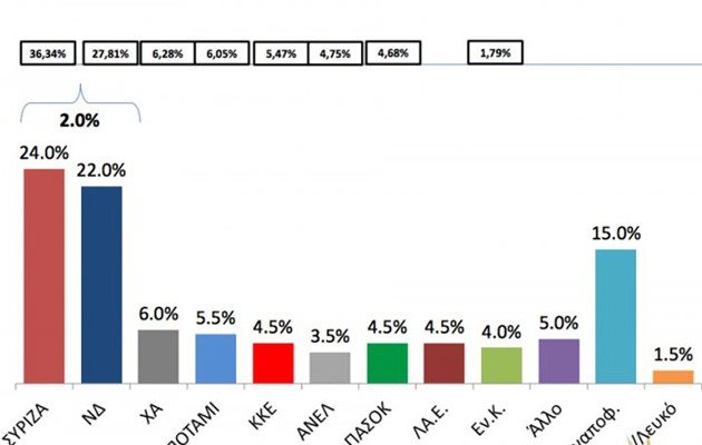 Στην πρόθεση ψήφου ο ΣΥΡΙΖΑ συγκεντρώνει 24% έναντι 22% της Νέας Δημοκρατίας ενώ συνολικά πάνω από το όριο του 3% βρίσκονται εννέα κόμματα.