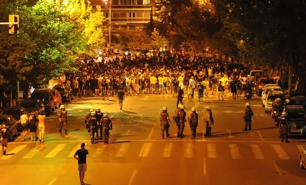 Συγκεκριμένα λίγο πριν τις 21:00, ανθρώπινο τείχος από αστυνομικούς της ομάδας των ΜΑΤ, προχώρησε σε αψυχολόγητα μέτρα λίγο πριν η πορεία φτάσει στο ξενοδοχείο Μακεδονία Παλλάς και οδηγήθηκε προς την Βασιλίσσης Όλγας.