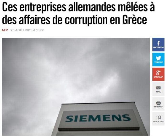 Aρκετές από τις εμβληματικές εταιρίες της Γερμανίας που δραστηριοποιούνται στη χώρα μας κατηγορούνται για συμμετοχή σε υποθέσεις διαφθοράς στην Ελλάδα, επιδεινώνοντας το χρέος της χώρας αναφέρει σε δημοσίευμά της η Liberation.
