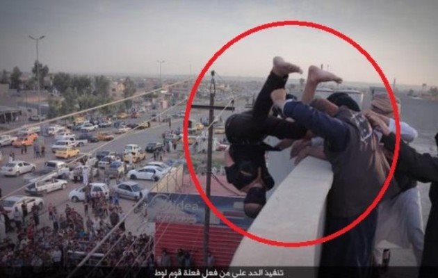 Σύμφωνα με τον θρησκευτικό νόμο της Σαρία, που εφαρμόζει το Ισλαμικό Κράτος, όταν ένας άνδρας κριθεί ένοχος ομοφυλοφιλίας, οδηγείται στο υψηλότερο κτίριο της περιοχής και από την ταράτσα πετιέται στο κενό.