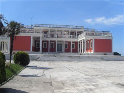 Η ιστορία του επιβλητικού κτιρίου ξεκινά στα τέλη της δεκαετίας του 1950, όταν άρχισε να κατασκευάζεται από το υπουργείο Δημοσίων Έργων σε έκταση περίπου 15 στρεμμάτων, στο ακρωτήρι του Μικρού Εμβόλου (Καραμπουρνάκι) στην Καλαμαριά. Το εμβαδό του είναι 1.604 τ.μ. σε δύο επίπεδα συν ένα υπόγειο εμβαδού 1.330 τ.μ., όπου υπήρχαν μαγειρεία, πλυσταριό και αποθήκες. Διαθέτει επίσης και 1.105 τ.μ. εξώστες. Η ανέγερσή του έγινε βάσει σχεδίων του αρχιτέκτονα Χριστόπουλου και θεωρείται χαρακτηριστικό δείγμα ανακτορικής νεοκλασικής αρχιτεκτονικής, με προπύλαιο και περιστύλιο αποτελούμενο από ιωνικούς κίονες. Στο οικόπεδο υπάρχει επίσης εκκλησάκι, ελικοδρόμιο καθώς και πρόσβαση στη θάλασσα, όπου υπήρχε μικρή μαρίνα ελλιμενισμού.