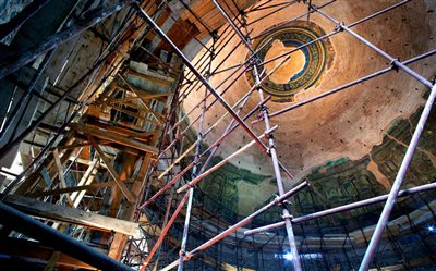 Η αντίστροφη μέτρηση για το ξήλωμα της σκαλωσιάς άρχισε τον περασμένο Απρίλιο. Ηταν Μεγάλη Εβδομάδα όταν ο προϊστάμενος Εφορείας Αρχαιοτήτων Πόλης Θεσσαλονίκης δρ Σταμάτιος Χονδρογιάννης εξέπεμπε SOS προς πάσα κατεύθυνση για τον κίνδυνο που διέτρεχε η Ροτόντα. Εκείνη την περίοδο, από τη χορταριασμένη της στέγη κρέμονταν, κυριολεκτικά, οι κήποι της Βαβυλώνας... Τι σήμαινε αυτό; Τα όμβρια ύδατα άρχισαν να γλείφουν εσωτερικά τον θόλο θέτοντας σε άμεσο κίνδυνο τα αριστουργήματα της ψηφιδωτής τέχνης. Αν η επέμβαση δεν ήταν άμεση, η ζημιά που θα προκαλούσε θα μπορούσε να είναι μη αναστρέψιμη.