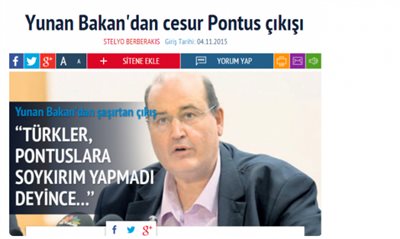 Η SABAH στο πρωτοσέλιδο αναφέρει ότι ο Υπουργός Παιδείας της Ελλάδας, Νίκος Φίλης, δήλωσε : «Είναι λάθος να λέγεται ότι οι Πόντιοι υπέστησαν γενοκτονία από τους Τούρκους». Το δημοσίευμα, συνεχίζει στις εσωτερικές σελίδες και αναφέρει: «Ο Έλληνας Υπουργός Παιδείας λέγοντας ότι Οι Τούρκοι δεν έκαναν γενοκτονία στους Πόντιους, προκάλεσε τις αντιδράσεις της Αντιπολίτευσης και ποντιακών συλλόγων».