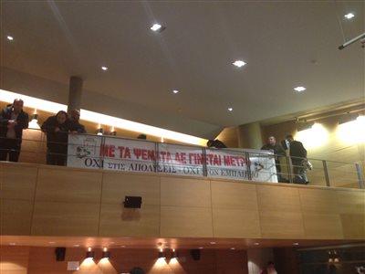 Οι εργαζόμενοι μπήκαν στην αίθουσα και ανήρτησαν πανό που έγραφε: «Με τα ψέματα δε γίνεται μετρό».