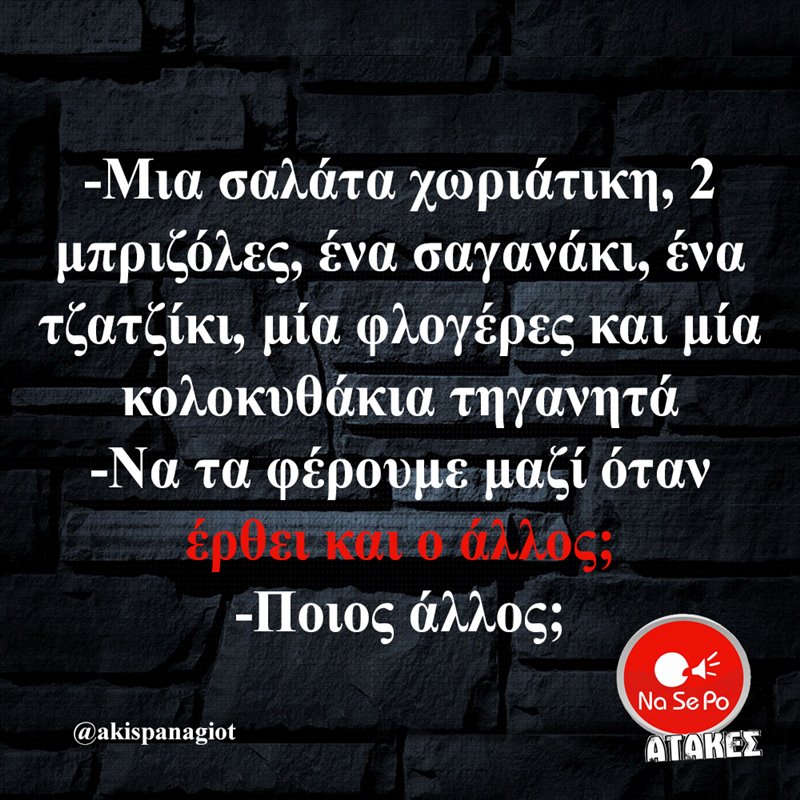 - Μια σαλάτα χωριάτικη, 2 μπριζόλες, ένα σαγανάκι, ένα τζατζίκι, μία φλογέρες και μία κολοκυθάκια τηγανητά - Να τα φέρουμε μαζί όταν έρθει και ο άλλος; - Ποιος άλλος; @akispanagiot