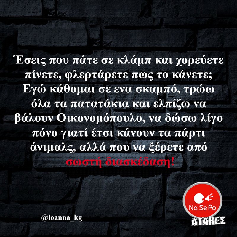 Έσεις που πάτε σε κλάμπ και χορεύετε πίνετε, φλερτάρετε πως το κάνετε; Εγώ κάθομαι σε ενα σκαμπό, τρώω όλα τα πατατάκια και ελπίζω να βάλουν Οικονομόπουλο, να δώσω λίγο πόνο γιατί έτσι κάνουν τα πάρτι άνιμαλς, αλλά που να ξέρετε από σωστή διασκέδαση! @loanna_kg