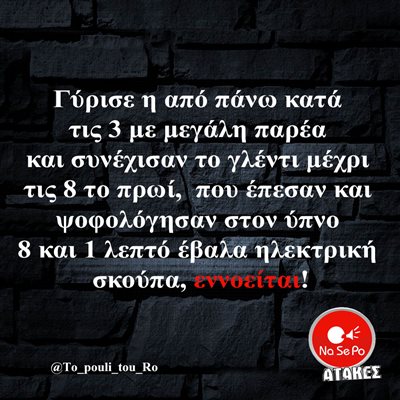 Γύρισε η από πάνω κατά τις 3 με μεγάλη παρέα και συνέχισαν το γλέντι μέχρι τις 8 το πρωί, που έπεσαν και ψοφολόγησαν στον ύπνο 8 και 1 λεπτό έβαλα ηλεκτρική σκούπα, εννοείται! @Τo_pouli_tou_Ro